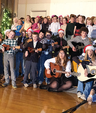 The guitar class, fifth graders K-third grade singers. The girl guitarists (left-toright) are: Keilani Garcia, Makayla Franklin, Leah Lunceford and Nyola Scheiner. Circling counter-clockwise to the rear are: Ammon Lacey, Tell Cox and Holden Harris joining in with the ukulele players.